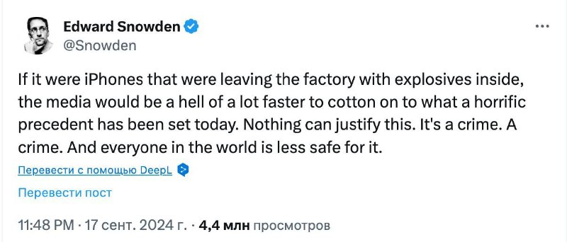 🇷🇺🇮🇱🇮🇷“What if iPhones came out of the factory with explosives inside?” Former NSA agent Snowden called the pager explosions in Lebanon a “terrible precedent.”