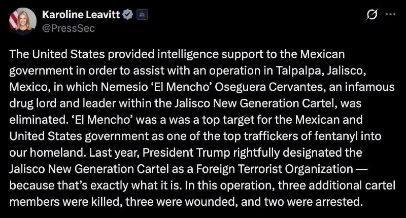 🇺🇸🇲🇽White House press secretary Caroline Livett confirmed that the US provided “intelligence support” to Mexico. The assistance was related to an operation that led to the killing of CJNG leader “El Mencho”. Washington states that the cooperation reflects the ongoing security coordination between the US and Mexico. View Source